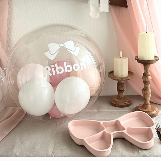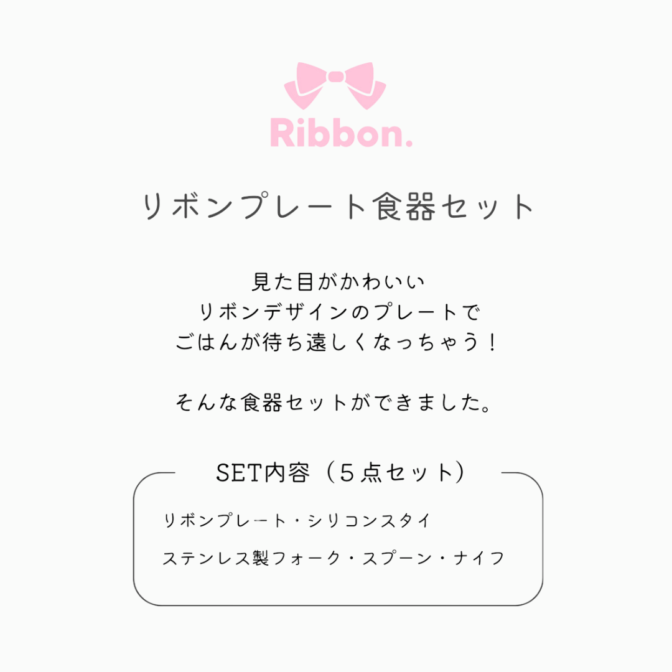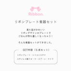 リボンのモチーフがめずらしい、食器とスタイ、カトラリーの5点セットです。